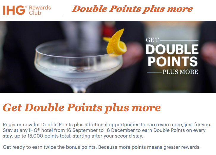 On Monday, the chain announced "Double Points plus more," its latest Accelerate-like global promotion. Register to earn Double Points on every stay — up to 15,000 points total — starting after your second stay at IHG hotels worldwide, along with additional targeted opportunities.