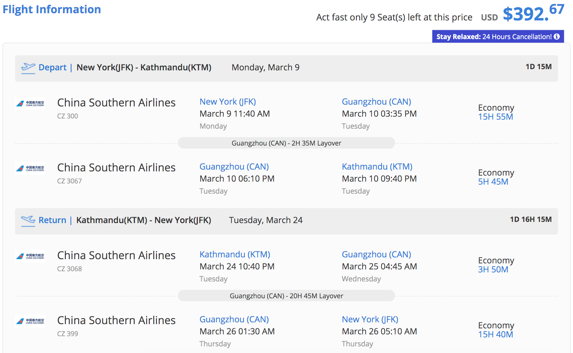 New York (JFK) to Kathmandu (KTM) for $393 round-trip on China Southern:
