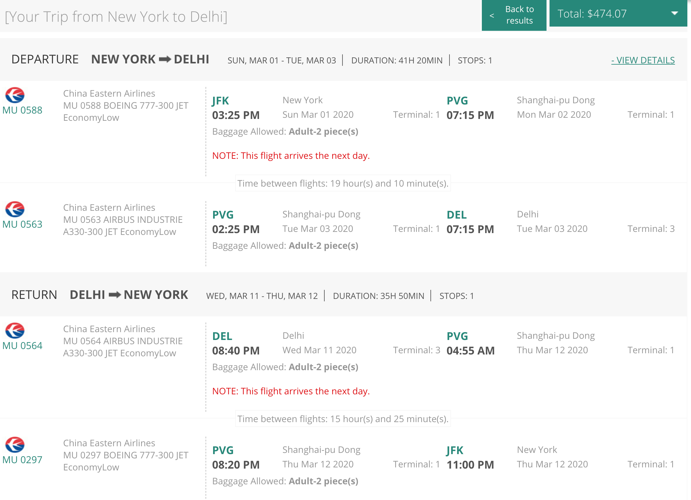 New York (JFK) to New Delhi (DEL) for $474 round-trip on China Eastern: