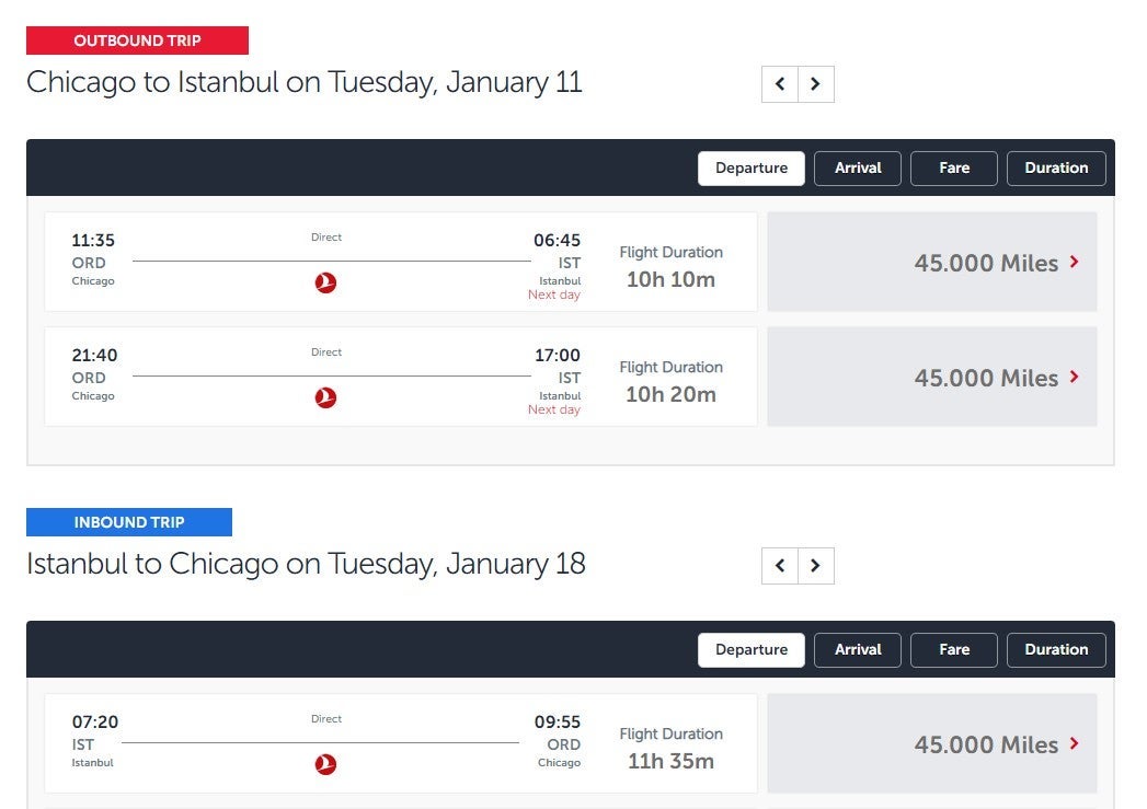 Similarly, ORD-IST in early January is available for 45,000 miles each way, a total of 90,000 miles round-trip (+$378.97 for taxes).