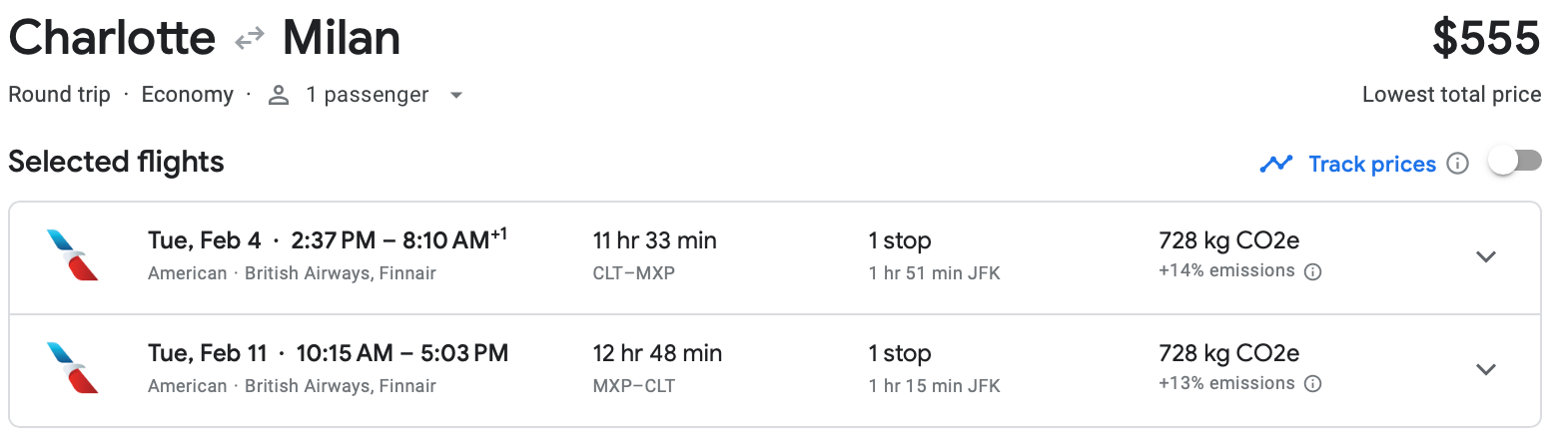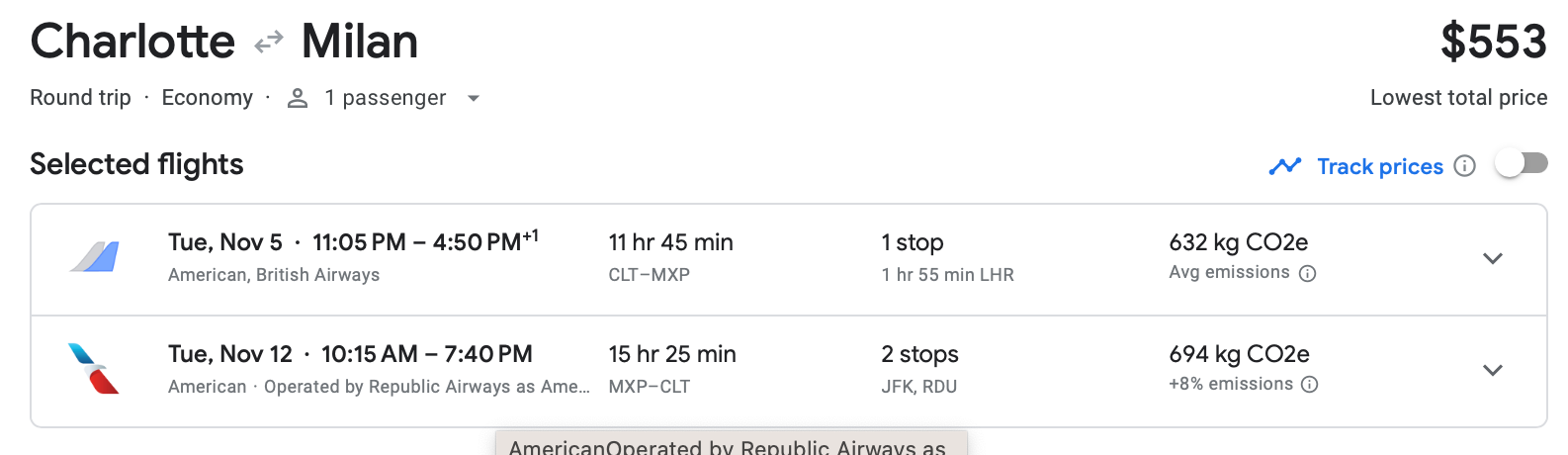There is good availability for flights from Charlotte Douglas International Airport (CLT) to Milan Malpensa Airport (MXP) in October and November on American Airlines. Tickets are currently going for $553 round-trip.