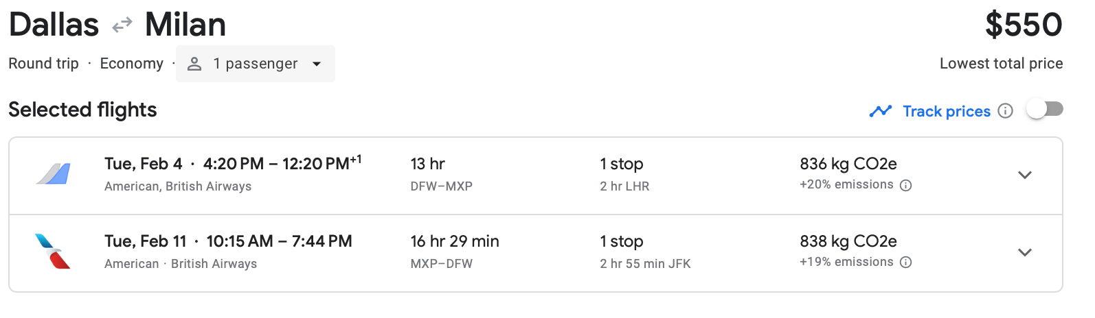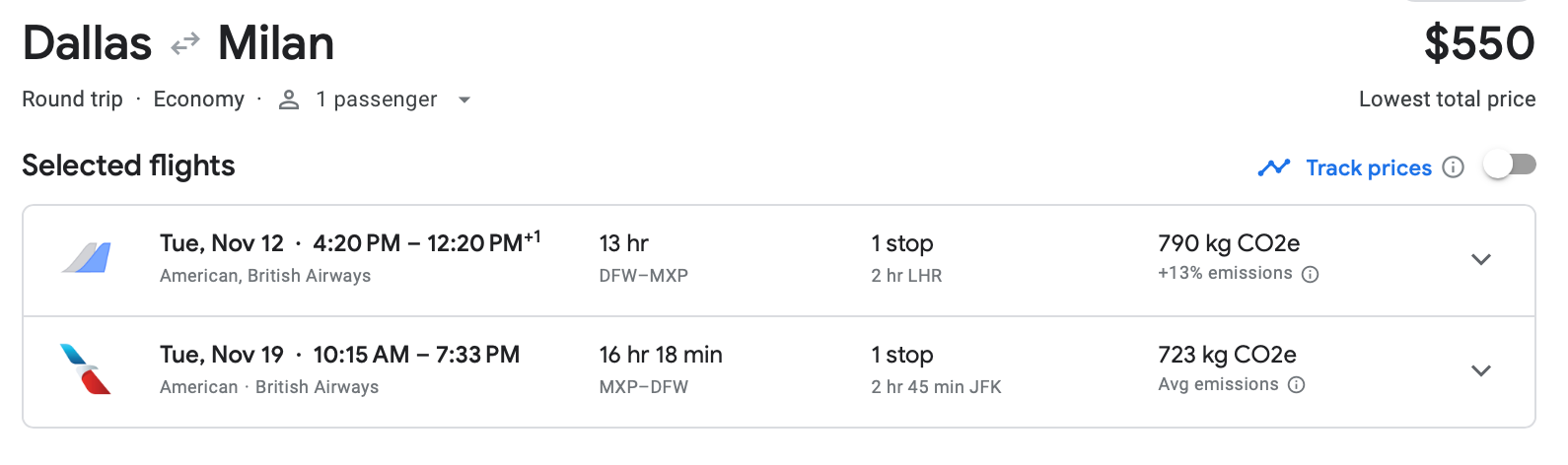 American Airlines is also offering the same trip from DFW to MXP in October and November for the same price.