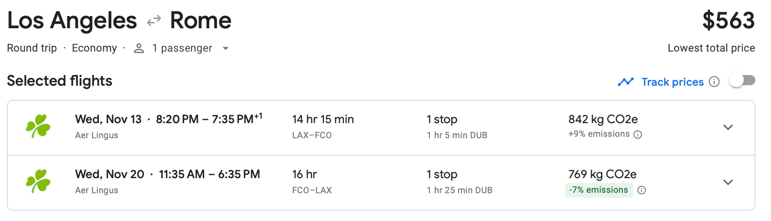 Aer Lingus has some reasonable options for a trip from the West Coast to Rome. You can book round-trip flights from Los Angeles International Airport (LAX) to Rome Fiumicino Leonardo da Vinci Airport (FCO) in November for $563.