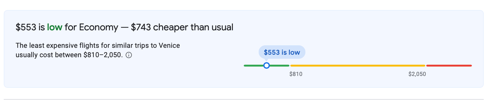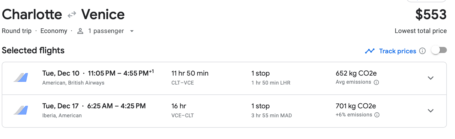 We'll end on one of the best bargains we found in this sale. You can snag a round-trip ticket on American Airlines from CLT to Venice Marco Polo Airport (VCE) in December for only $553.