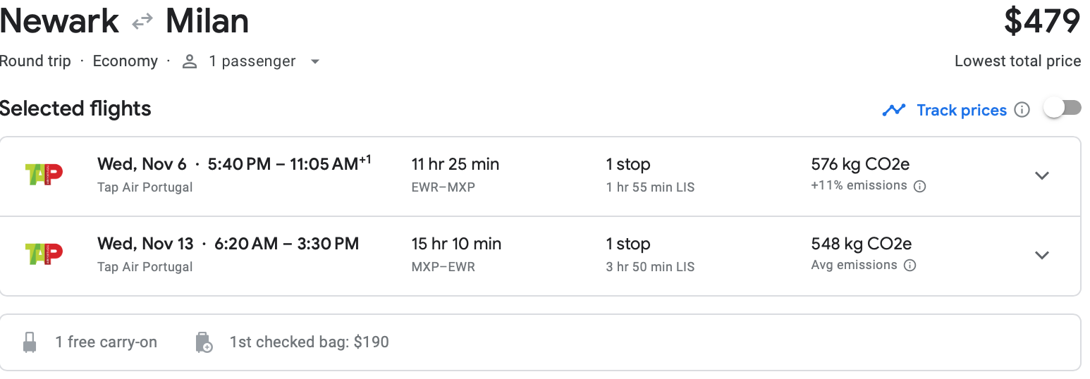 There is good availability from Newark to Milan in November. We found flights from EWR to Milan Malpensa Airport (MXP) on TAP Air Portugal for only $479 round-trip. There is a layover each way. Also, note that you get a free carry-on, but it will cost you a lot to check a bag. In other words, pack light to take advantage of this deal.