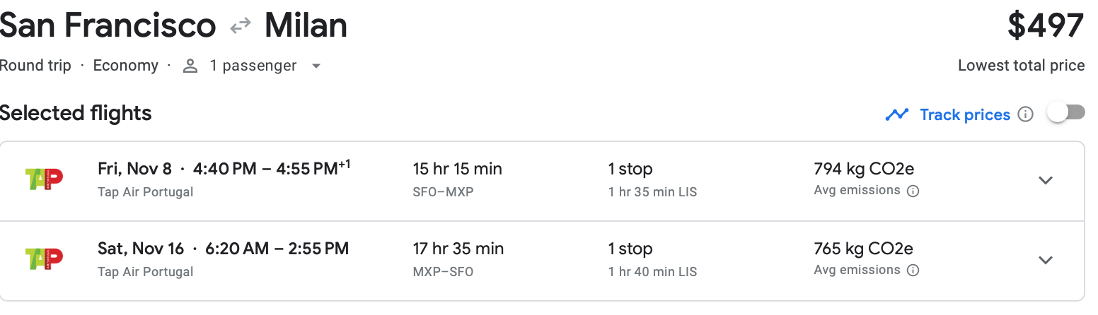 TAP Air Portugal has flights from San Francisco International Airport (SFO) to Milan in November for less than $500 round-trip — another solid discount. If you live in San Francisco, the flights to Milan in this deal were the best bargains by far.