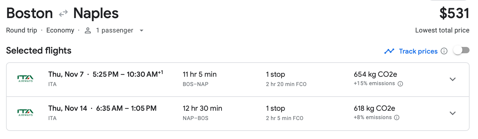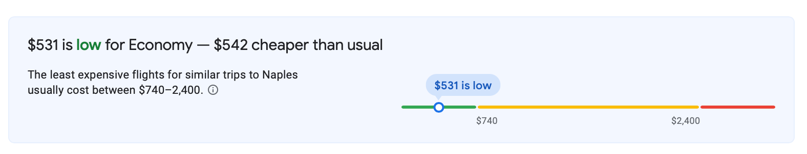 We saw lots of flights to Naples in November and December for that price, which Google Flights data indicates is about half the usual cost.