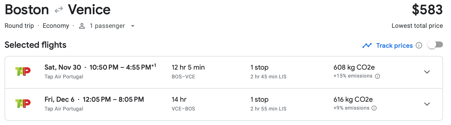 There are lots of flights on sale from Boston to Venice as well. We found itineraries in late November after Thanksgiving to Venice for less than $600 — a big discount from typical prices.
