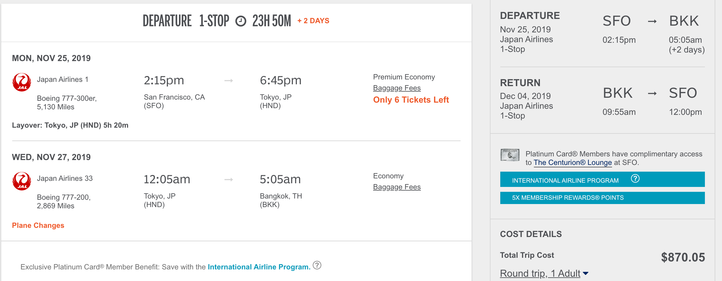 San Francisco (SFO) to Bangkok (BKK) for $870 round-trip in premium economy: