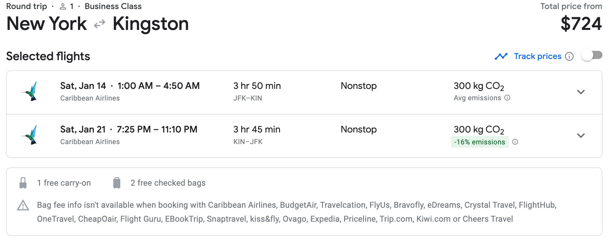 Flights on Caribbean Airlines and American Airlines will be nonstop in business class. Flights on Delta Air Lines will be in the first-class cabin, with a layover in Atlanta. All three options will include two checked bags free of charge, as well as one carry-on and one personal item.