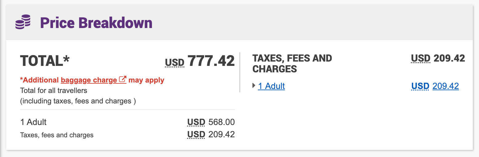 The final price as reflected on the Caribbean Airlines website is $777.42, with the fare itself being $568 but taxes, fees and other charges amounting to an additional $209.42.