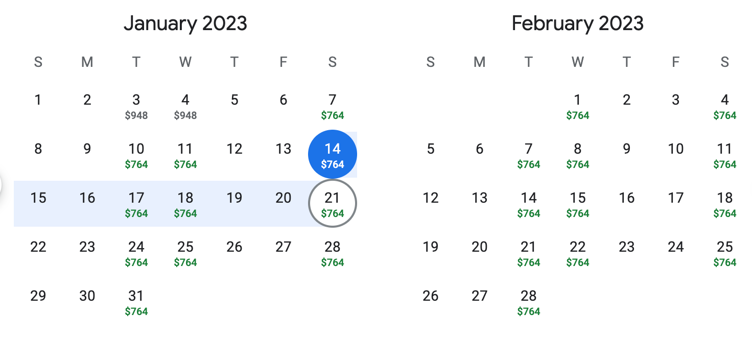For example, you could book this round-trip flight departing on January 14, 2023, and returning on January 21, 2023, for $777.