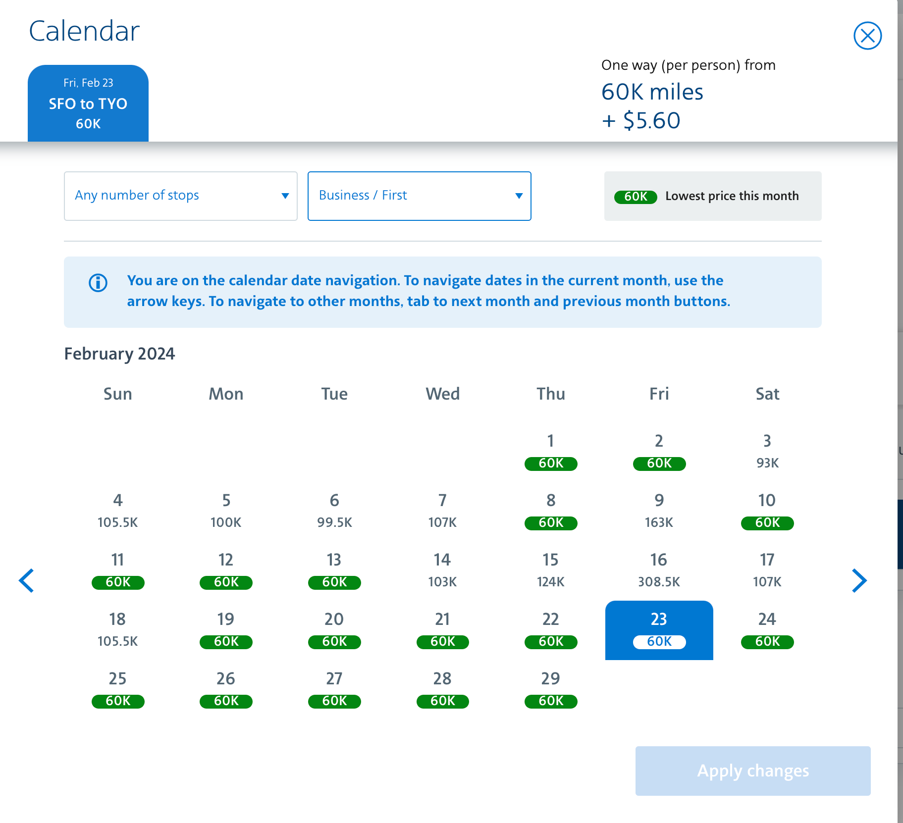 As you can see by running a flexible-date search, there is widespread availability in February and March for one person from San Francisco International Airport (SFO) to Tokyo-area airports (represented by the code TYO).