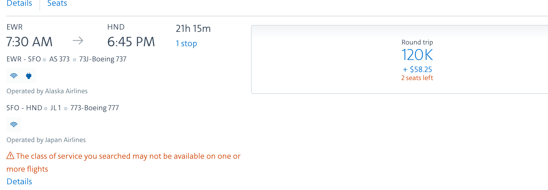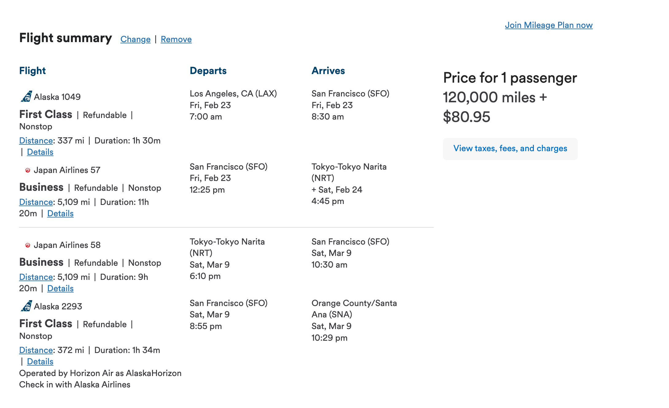As mentioned, you can also find these trips using Alaska Mileage Plan miles. The availability doesn't appear to be as widespread via Alaska, but I was able to find flights from Los Angeles International Airport (LAX) to Tokyo for 120,000 Alaska miles plus about $81 in taxes and fees.