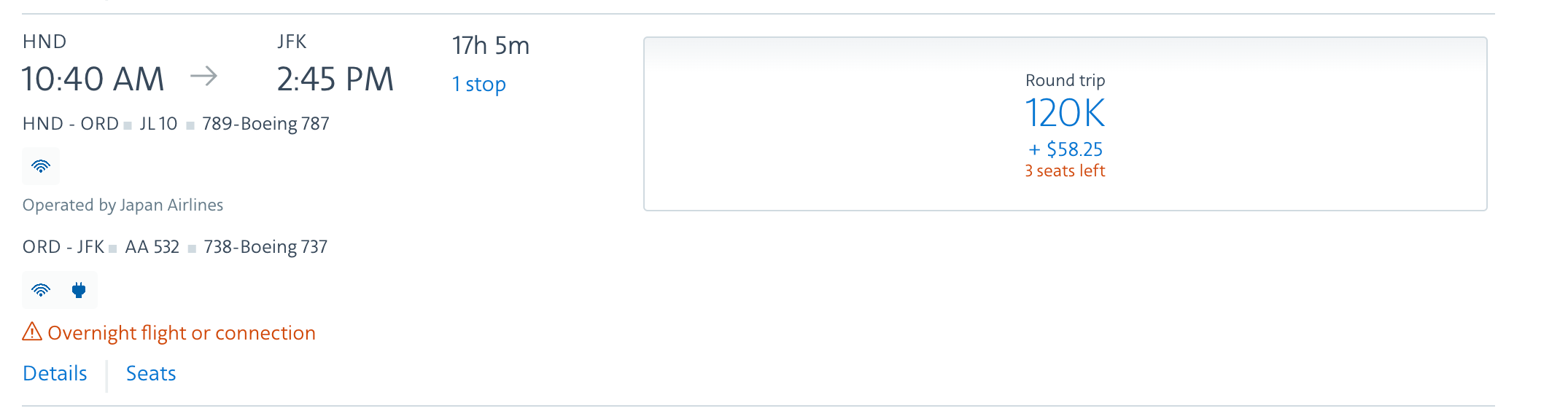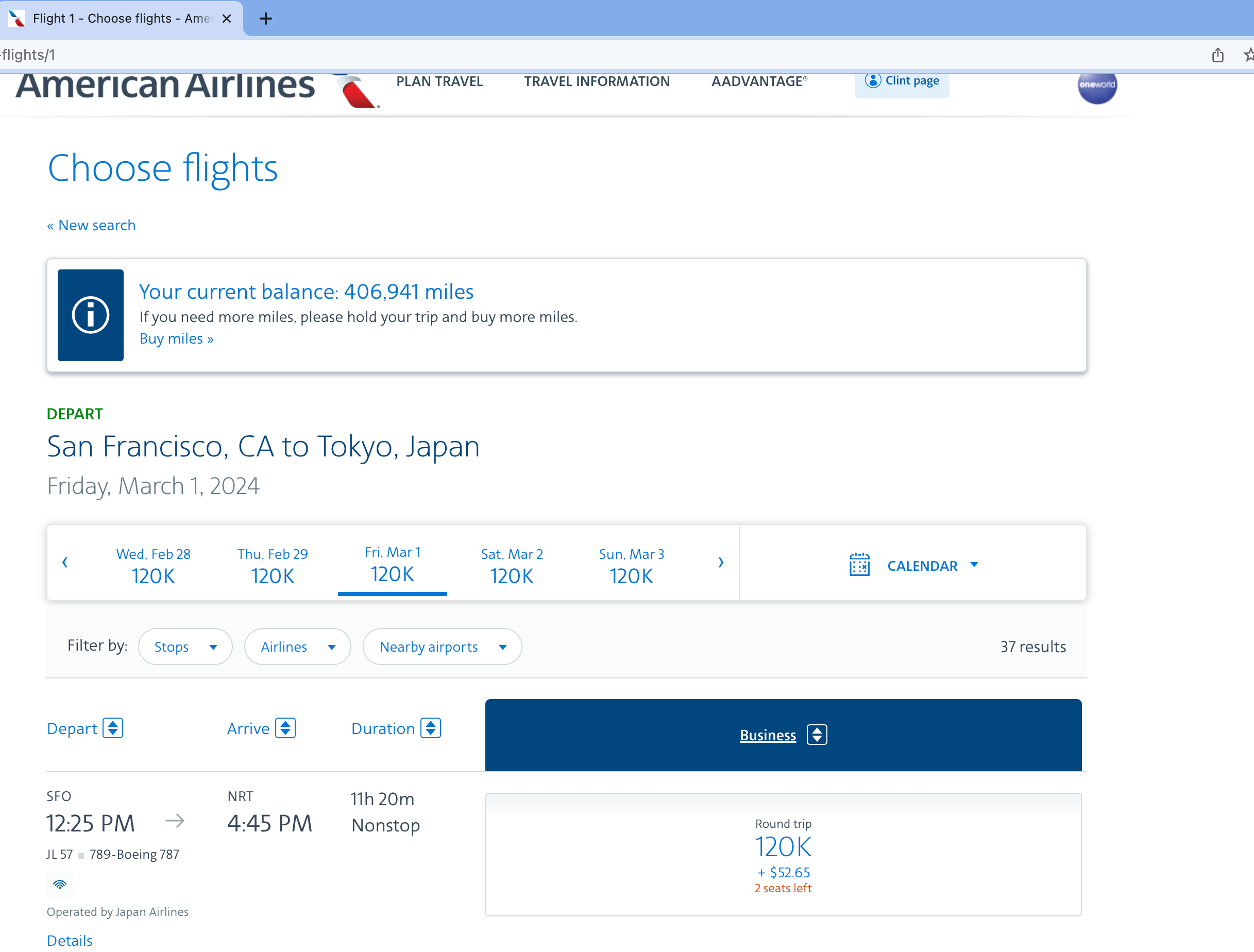 I booked tickets from the New York City area to Tokyo for 120,000 American AAdvantage miles.