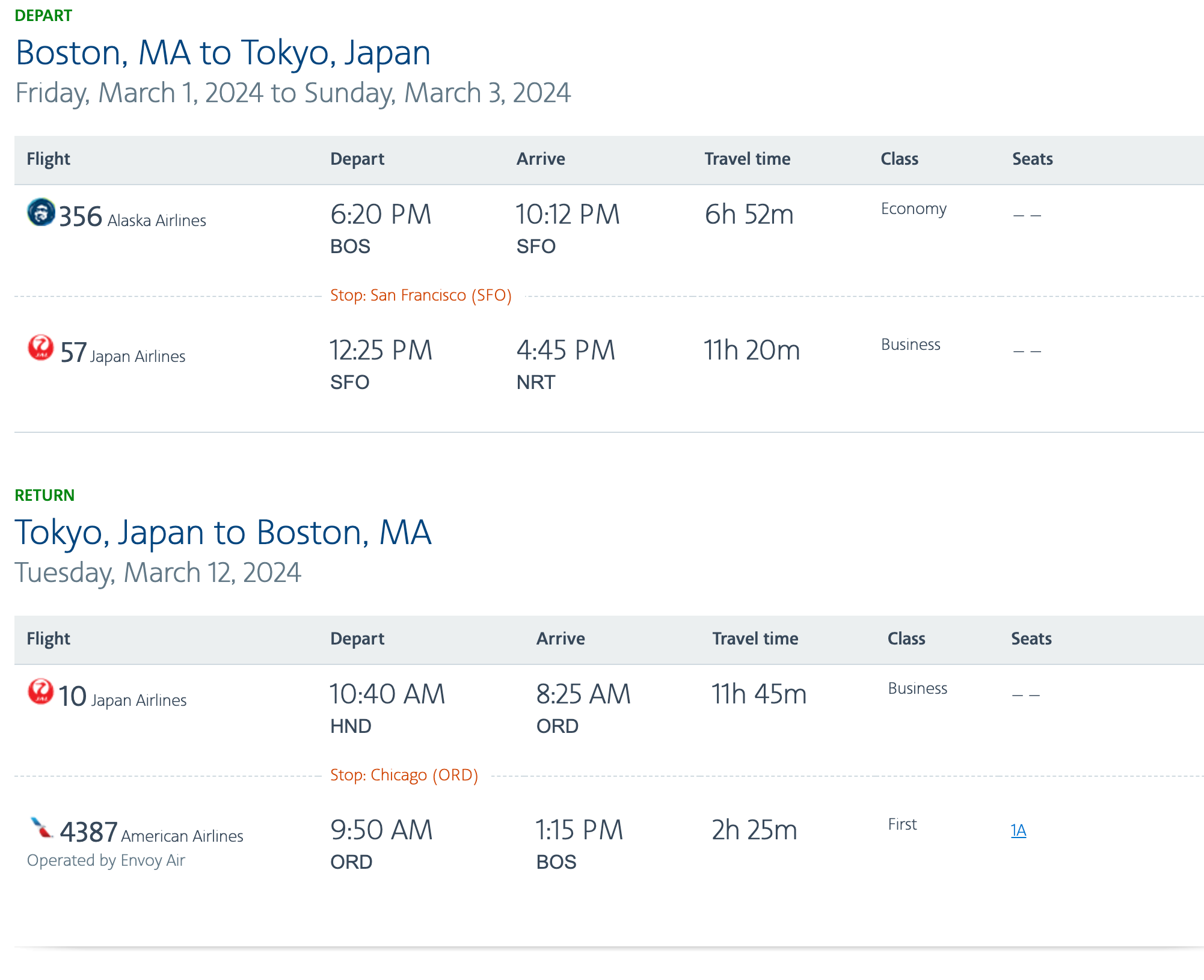 I'll be flying from Newark to San Francisco on Alaska in first class before connecting to Haneda Airport (HND) on Japan Airlines business class. That's one of the best values I've found for American Airlines miles in a long time.