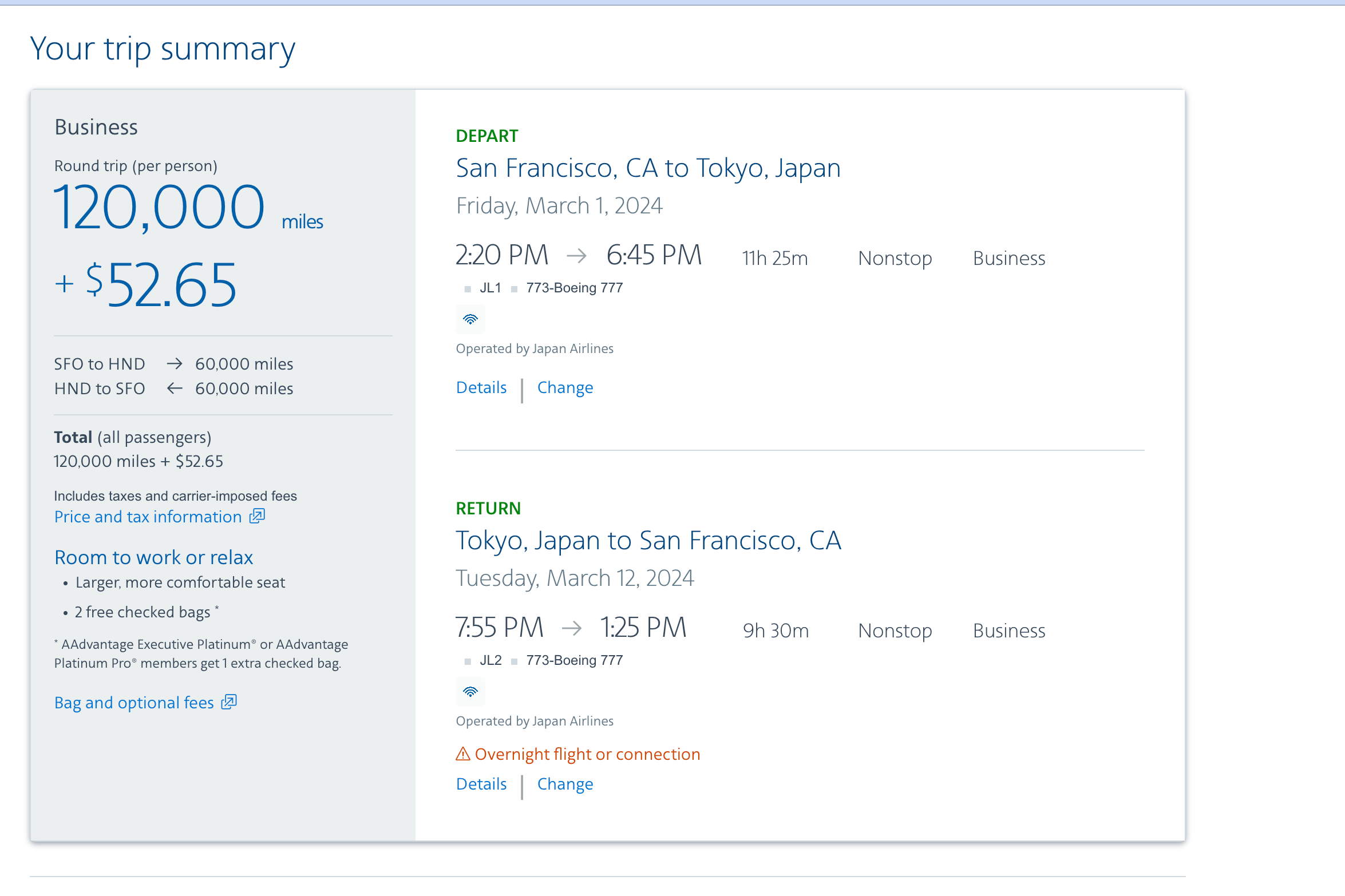To book round-trip business class on Japan Airlines using American Airlines on this example itinerary from San Francisco, it would be 120,000 American miles plus $52.65 all-in. That's a fantastic deal for a seat that sells for thousands of dollars.
