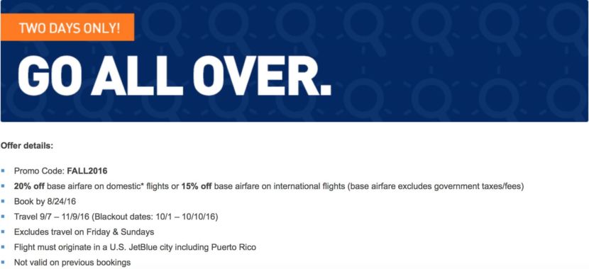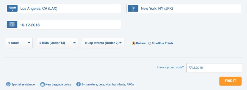 To use this promotion, you must book at jetblue.com/promo and enter the promo code: FALL2016. When searching you should see a crossed out price on the search page followed by a reduced price. The promotion code is valid through Wednesday, August 24, at 11:59pm EST.