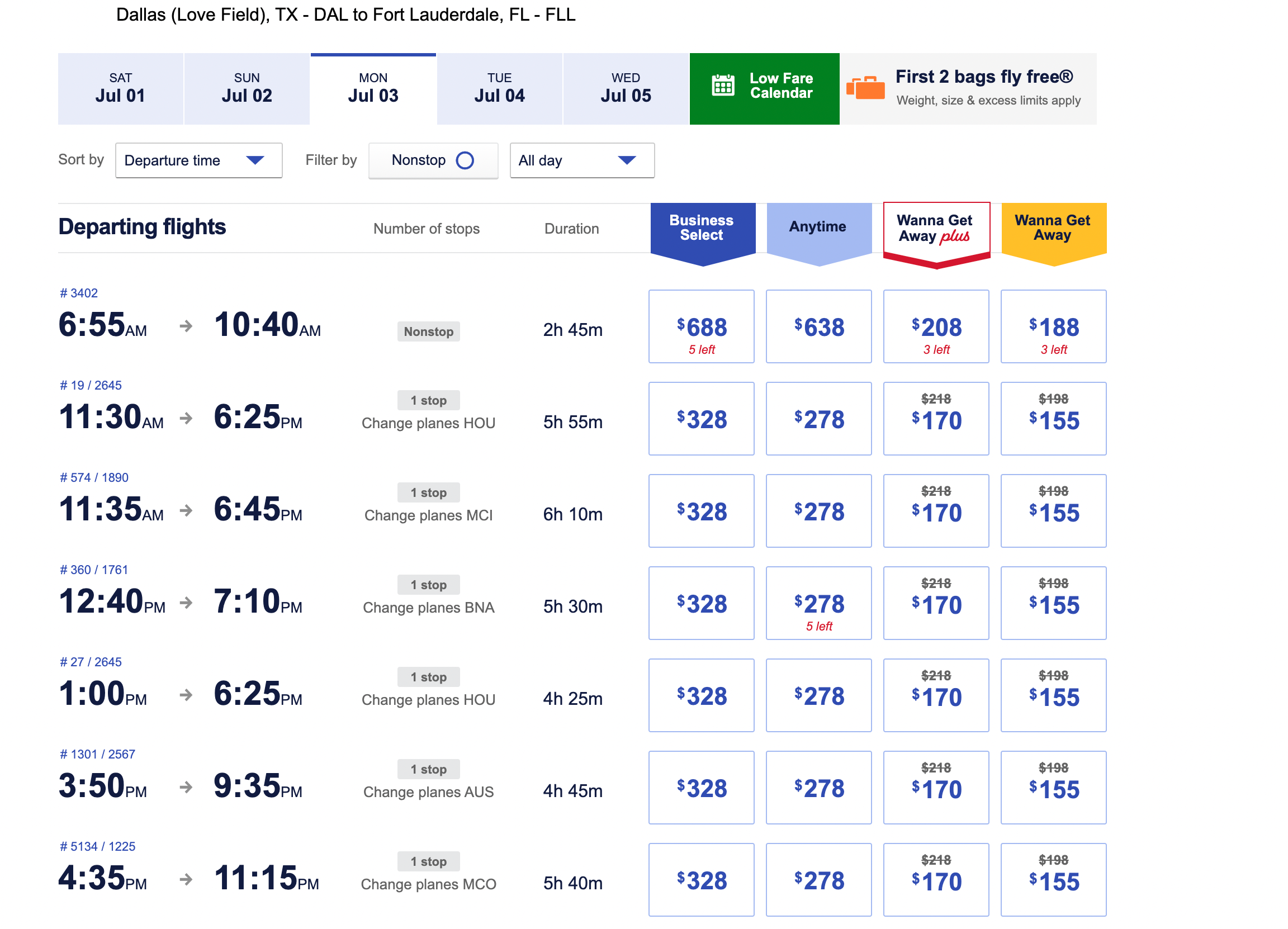 One of the routes we found with decent availability was from DAL to FLL, where you could book flights for as low as $155.
