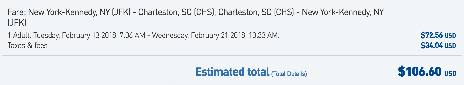 New York (JFK) to Charleston (CHS) for $107 round-trip: