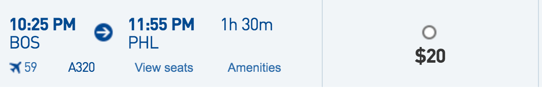 Boston (BOS) to Philadelphia (PHL) for $20 one-way in Blue Basic: