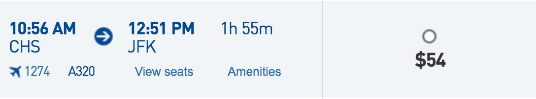 Charleston (CHS) to New York (JFK) for $54 one-way in Blue Basic: