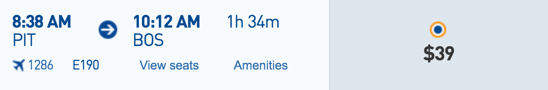 Pittsburgh (PIT) to Boston (BOS) for $39 one-way in Blue Basic: