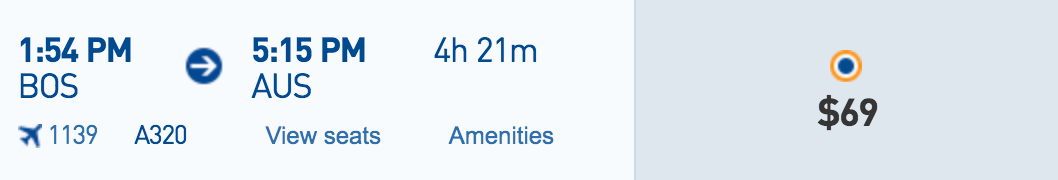 Boston (BOS) to Austin (AUS) for $69 one-way in Blue Basic:
