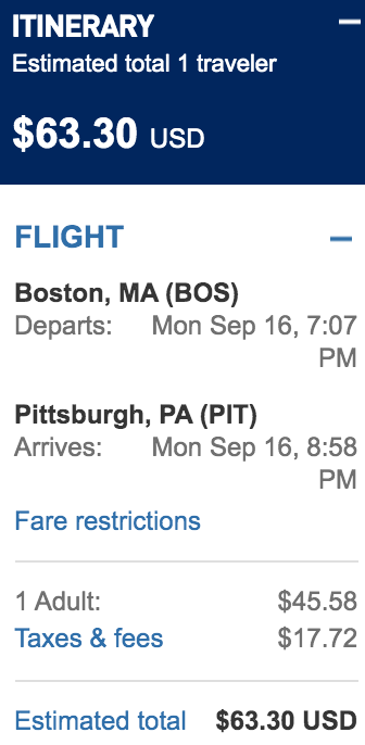 Boston (BOS) to Pittsburgh (PIT) for $63 one-way:
