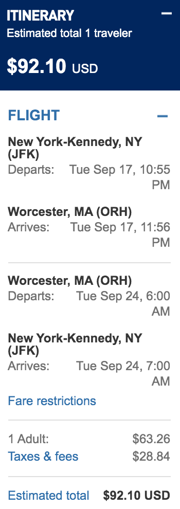 New York (JFK) to Worcester (ORH) for $92 round-trip: