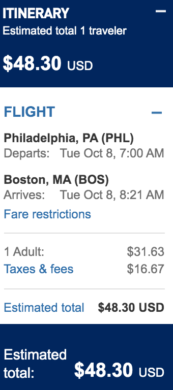 Philadelphia (PHL) to Boston (BOS) for $48 one-way: