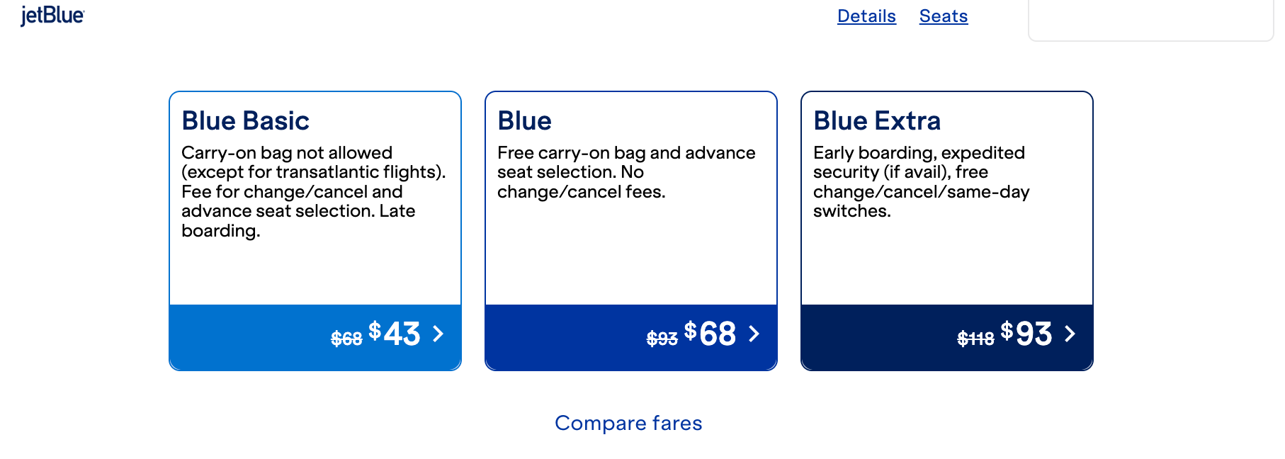 Change and cancel fees apply to the Blue Basic fare. Both the Blue and Blue Extra fares allow complimentary flight changes, and the latter also includes early boarding.