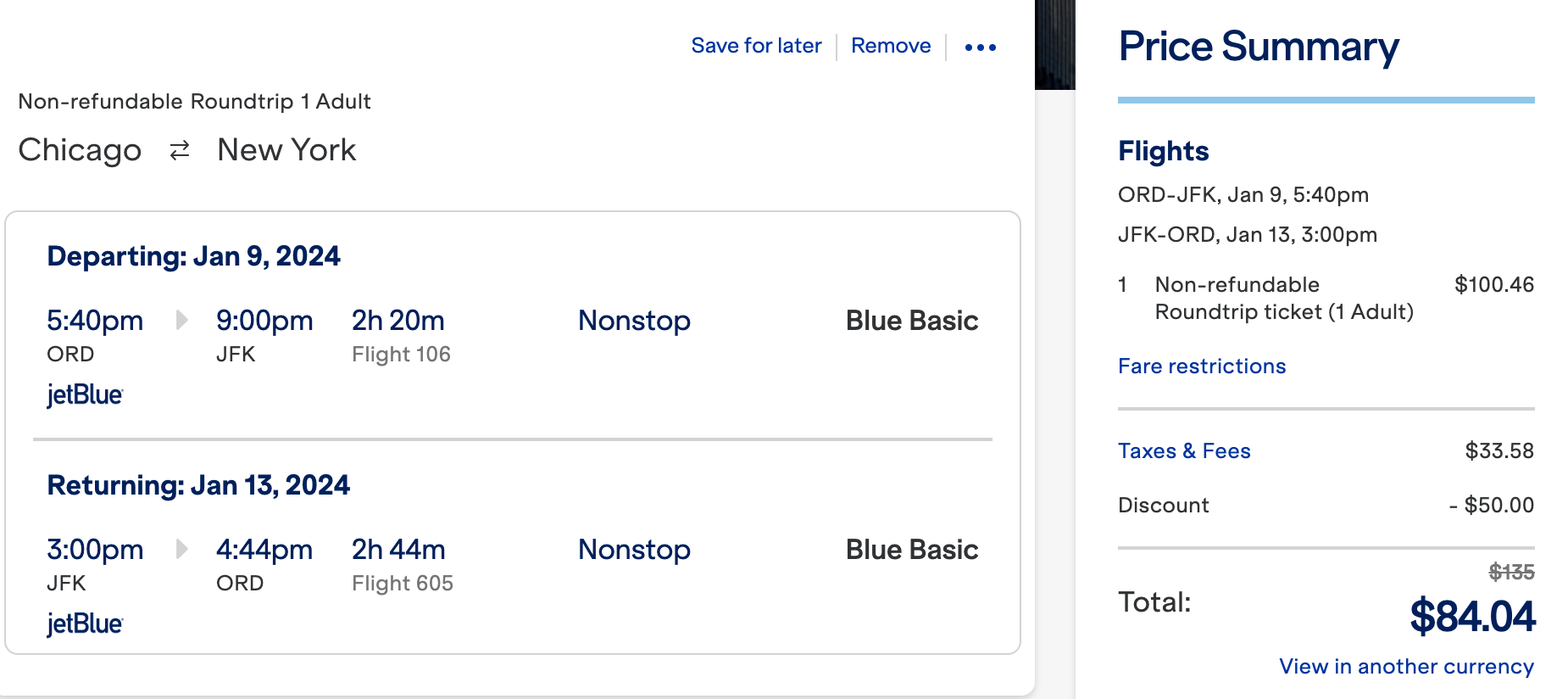 For example, the below round-trip January flight from Chicago's O'Hare International Airport (ORD) to New York's John F. Kennedy International Airport (JFK) is available to book for $84, making it $50 cheaper than the original base fare of $135.