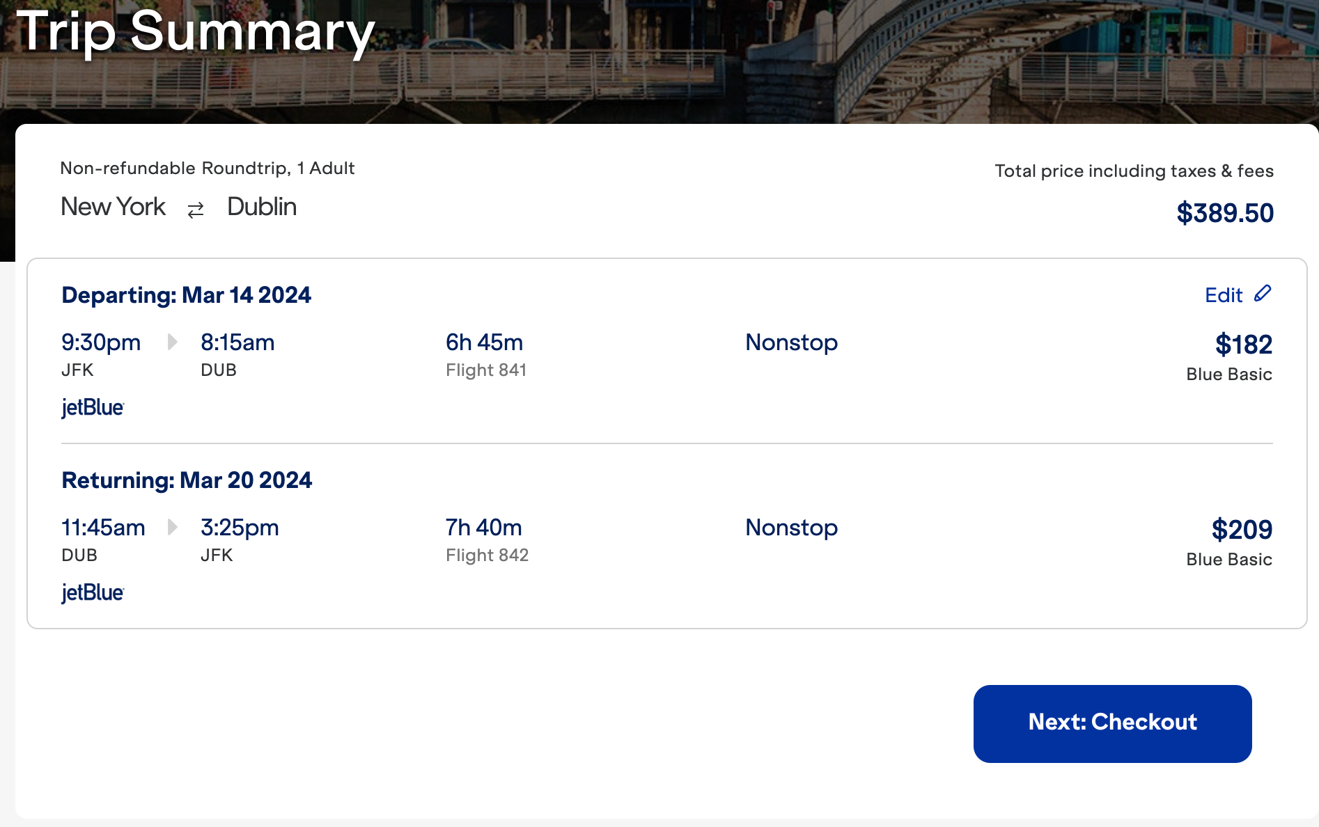 JetBlue flights from New York City and Boston to Dublin are available now for travel beginning in March. Flights from New York City to Edinburgh are available now for travel starting in May.