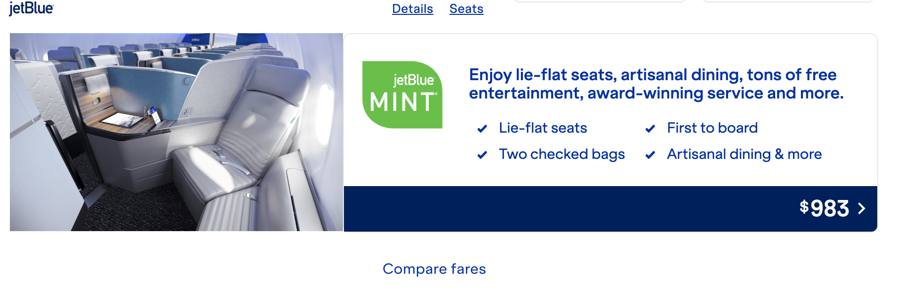 You can book this same flight in Mint, JetBlue's award-winning business class, for just less than $2,000 round-trip.