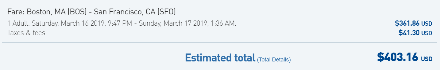 Boston (BOS) to San Francisco (SFO) for $403 one-way: