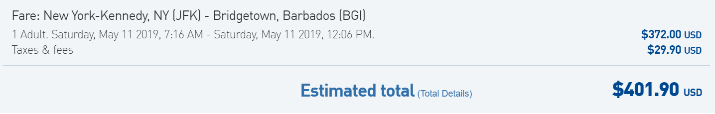 New York Kennedy (JFK) to Bridgetown (BGI) for $402 one-way: