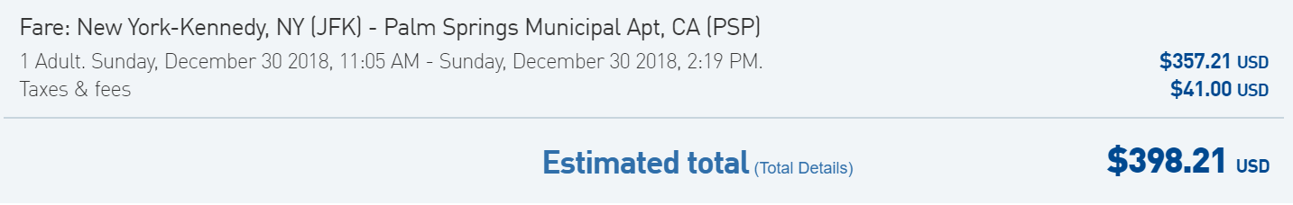 New York Kennedy (JFK) to Palm Springs (PSP) for $398 one-way: