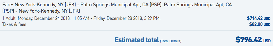 New York Kennedy (JFK) to Palm Springs (PSP) for $796 round-trip: