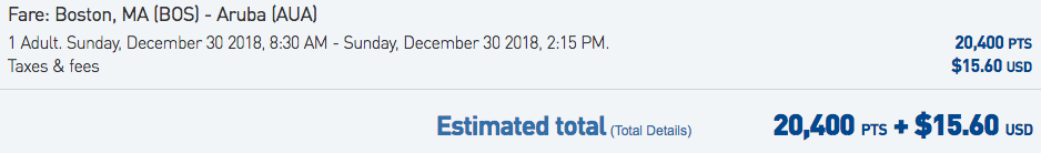 Boston (BOS) to Aruba (AUA) for 20,400 points + $15.60 one-way: