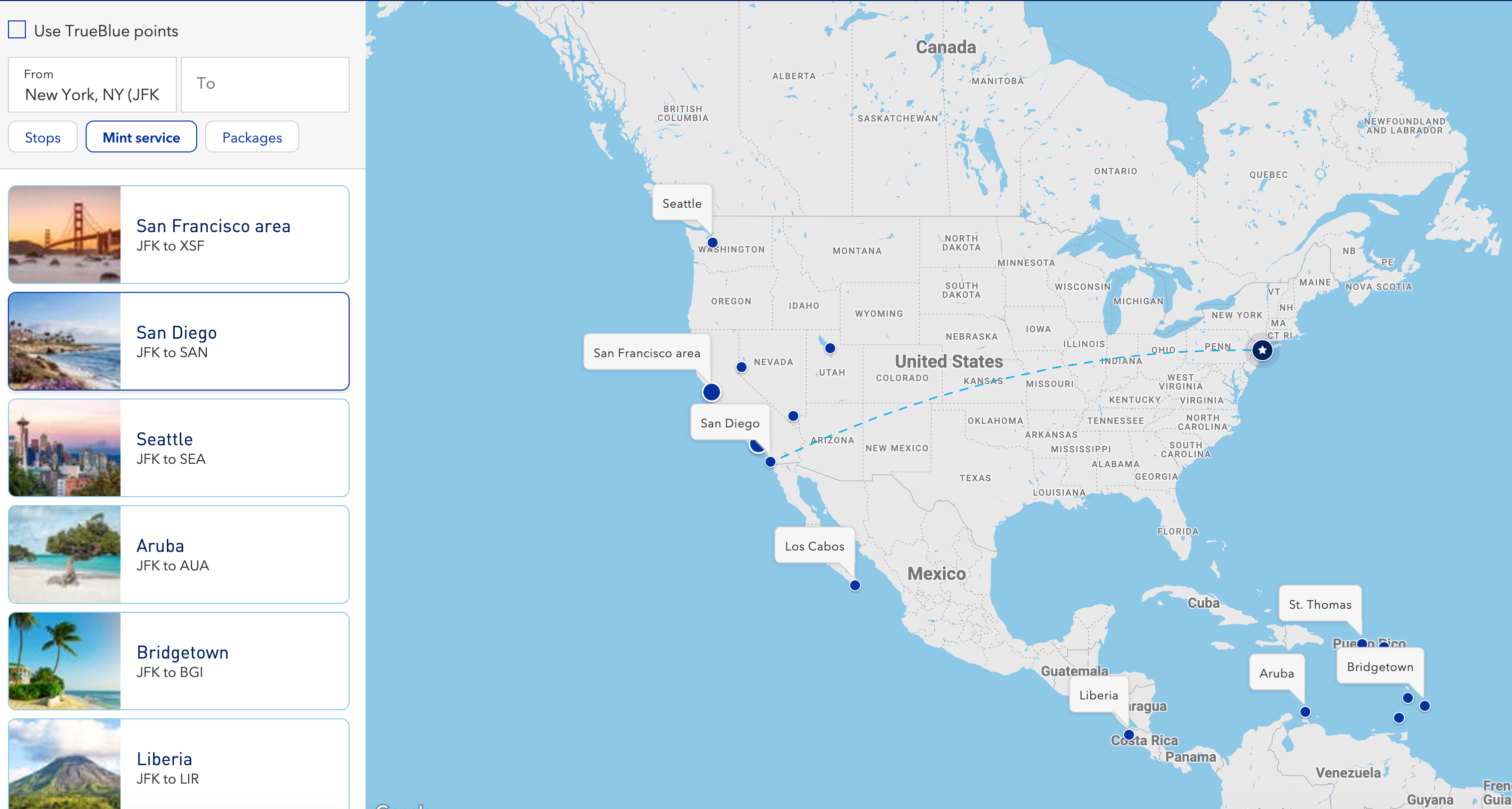 Say you want to book a round-trip journey from Seattle to New York City. Explore Mint routes by clicking the below button on JetBlue's website.