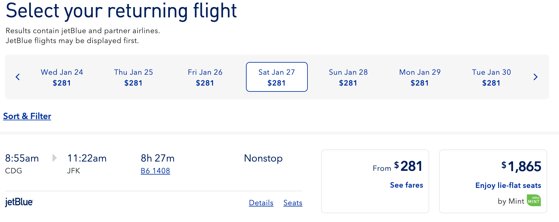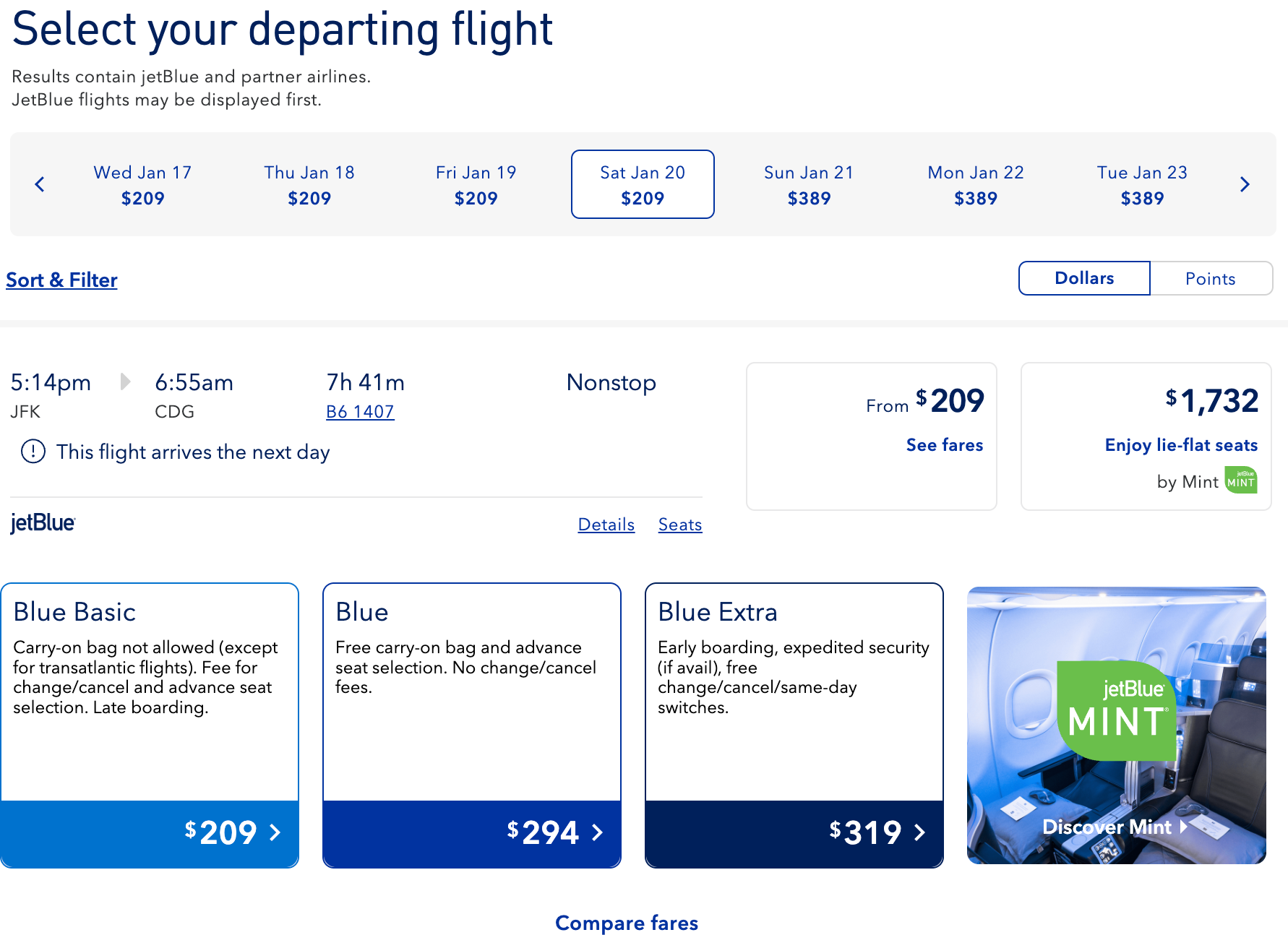 To score these flight deals, you can search directly on JetBlue's website. Let's say you want to take a weeklong trip in January and fly basic economy. You can take an overnight flight Jan. 20 and arrive in Paris in the early morning.