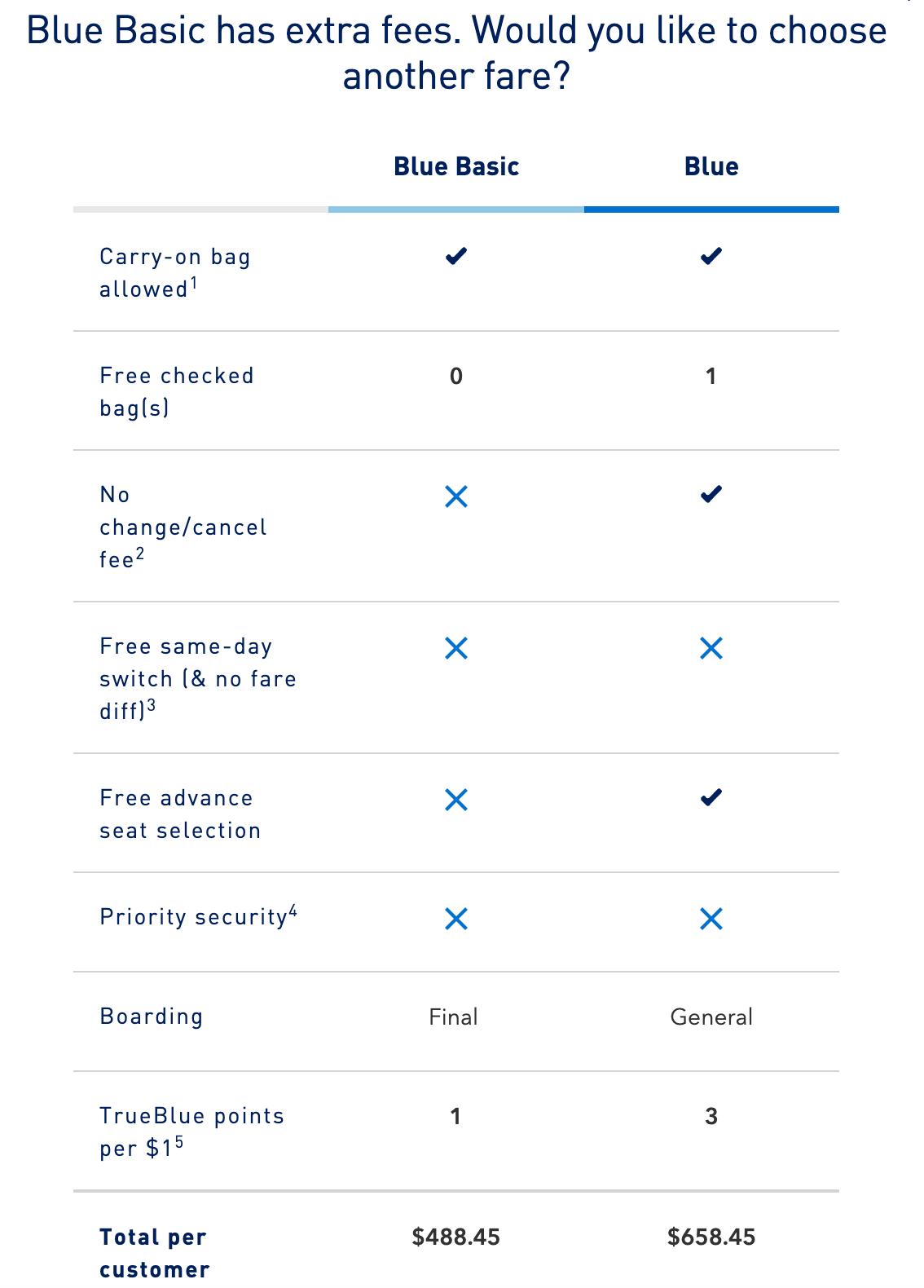 Your round-trip total will come to $488. Again, these low prices apply only to the Blue Basic fare, which has many restrictions. It allows passengers one carry-on bag, but all checked luggage costs extra. You'll also incur a fee if you change or cancel your flight or select your seat.