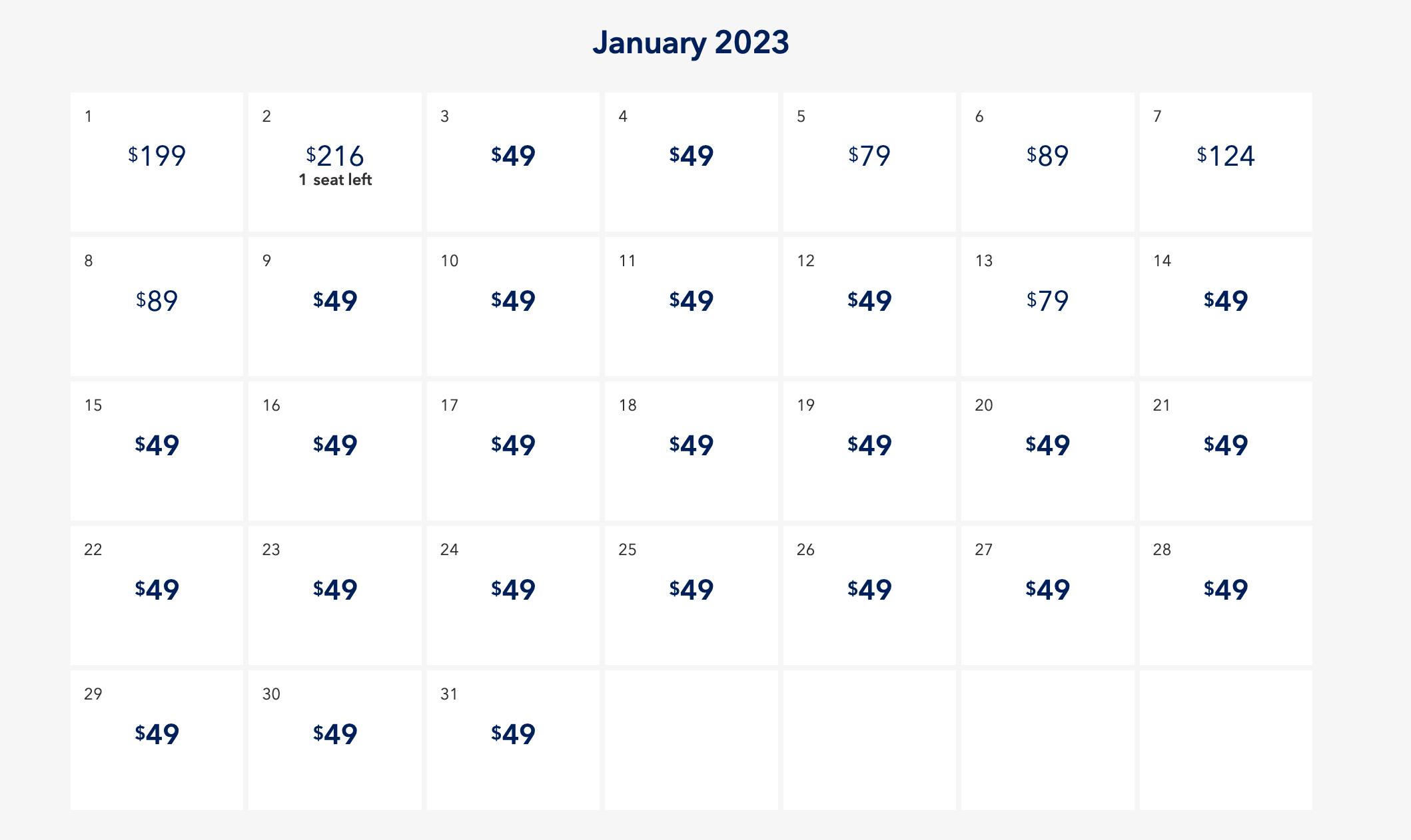 If you decide to book a trip from LGA to Charleston, JetBlue's calendar shows ample availability for $49 one-way fares for the months of January and February.