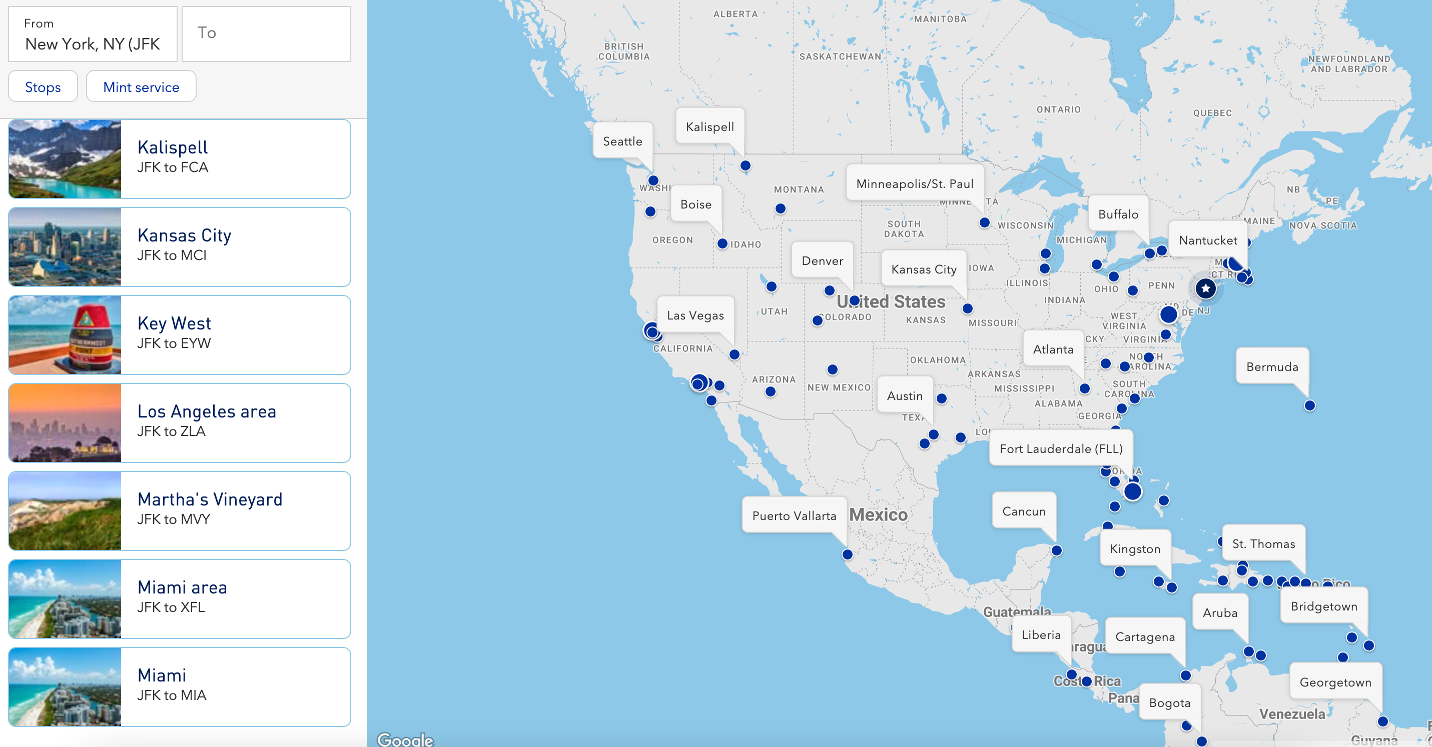 Routes: Nonstop flights across the JetBlue network (excluding transcontinental flights).