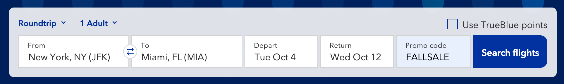 Just remember to make sure the flights you're booking aren't transcontinental, don't have any layovers, aren't Mint fares and don't include Friday and Sunday travel — those are excluded from this sale. Make sure the FALLSALE promo code is applying, and your travel dates are within the Sept. 7 through Nov. 16 time frame.