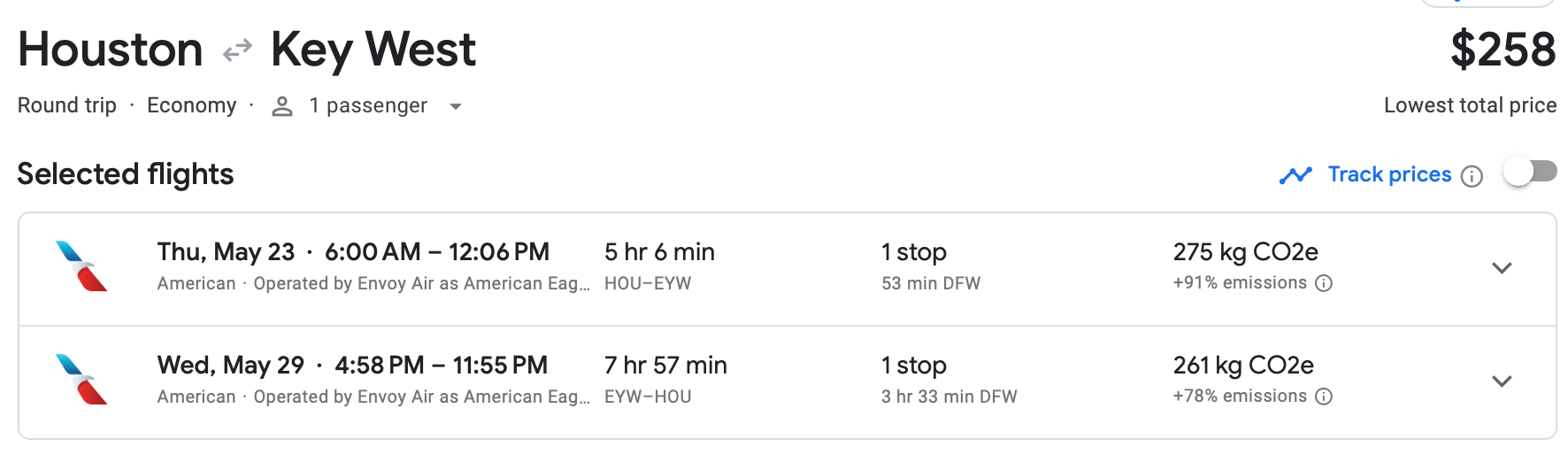 If you live in Houston, you can save big money on a Memorial Day weekend getaway to the Keys. You can book a roundtrip economy ticket on American for only $258, which is a huge discount off normal prices for this route.