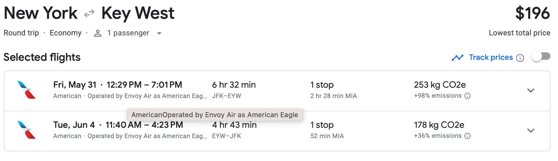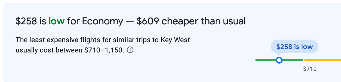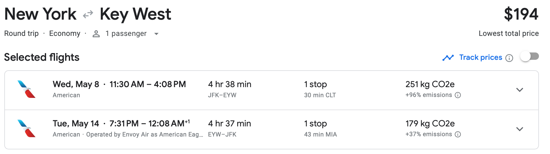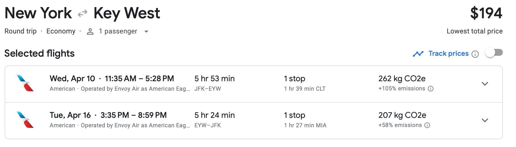 You can fly out of New York City's John F. Kennedy International Airport (JFK) to Key West International Airport (EYW) in April for just $194 roundtrip, a discount of almost 50% from typical prices. This is American's basic economy tier, which gets you a free carry-on but no seat selection.
