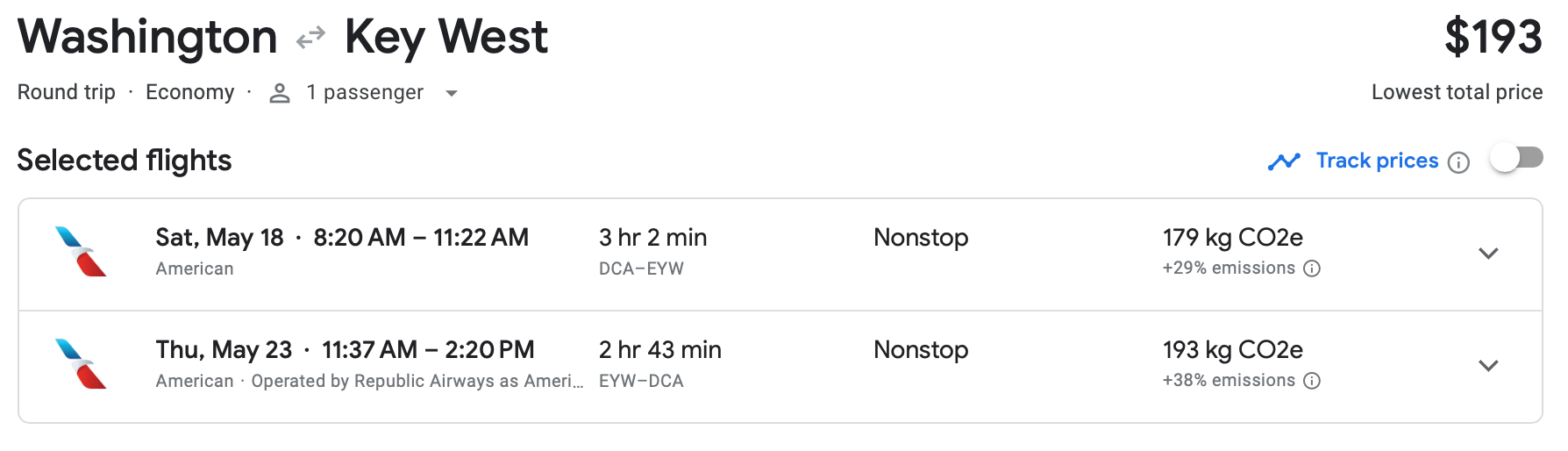 We found lots of discounted flights from the nation's capital. For example, American has roundtrip tickets from Ronald Reagan National Airport (DCA) to the Keys for only $193 -- and it's a nonstop flight.