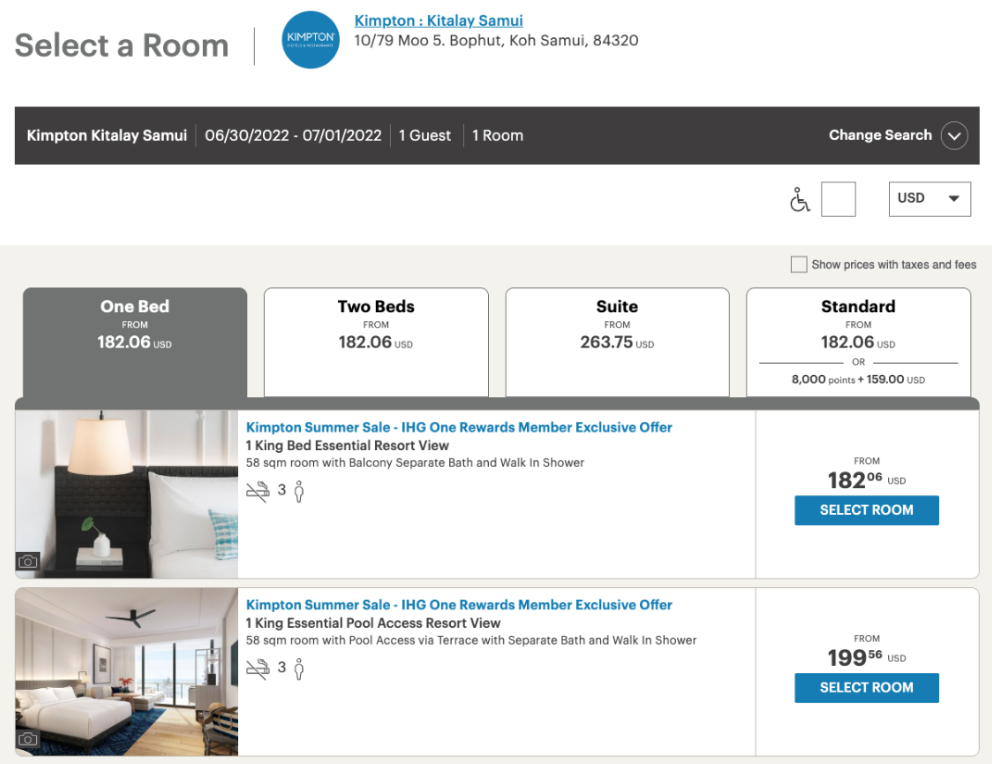 For example, you could book a stay in late June at the Kimpton Kitalay Samui in Koh Samui, Thailand, starting at $214 per night. Here, the one-bed option has a king bed, while the two-bed option has two twins. However, they have the same starting price.